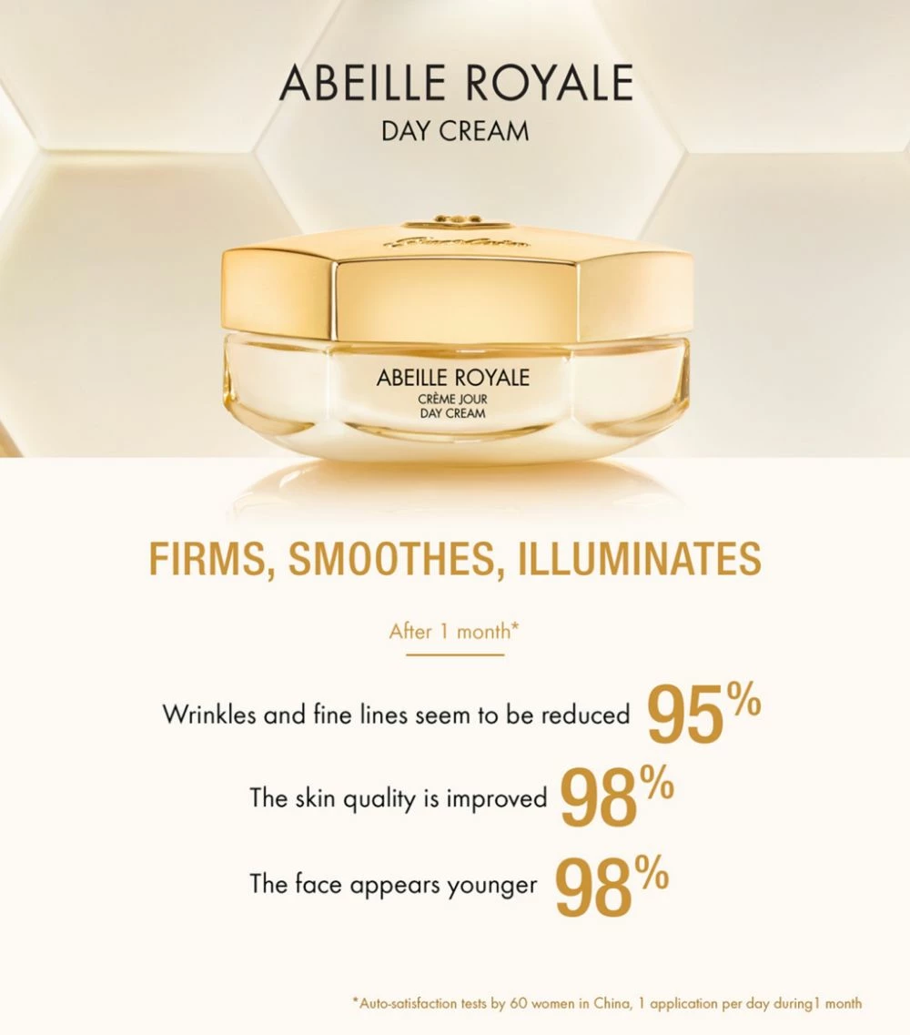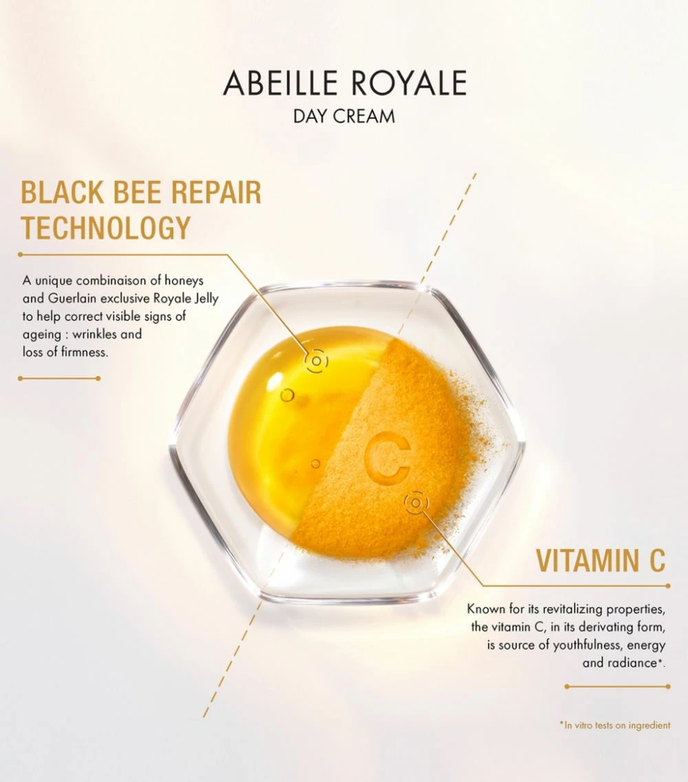 Formulated to transform your complexion immediately and lastingly, the Guerlain Abeille Royale Day Cream boasts a lightweight and nourishing texture, infused with BlackBee Repair technology and a vitamin C derivative, perfect for firming and boosting natural luminosity. This velvety cream will help to minimise the appearance of fine lines and wrinkles, resulting in a firmer and smoother visage that glows with a youthful radiance.